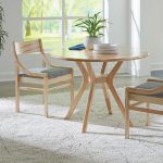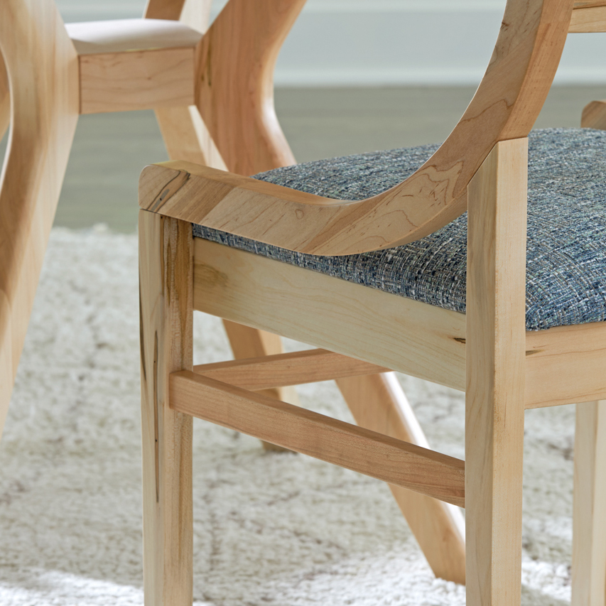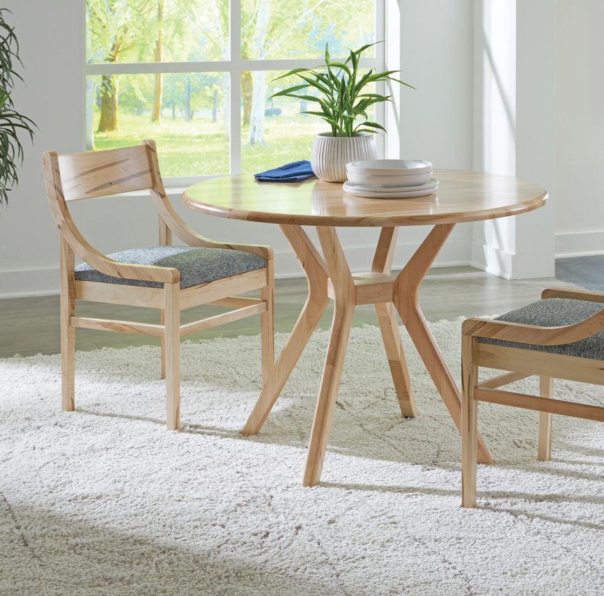 CHAIR: Gia, Wormy Maple Wood, 2404 Bering Fabric & 100 Natural Stain TABLE: Oslo Top, Rounded Edge, Single Oslo Pedestal, Wormy Maple Wood & 100 Natural Stain